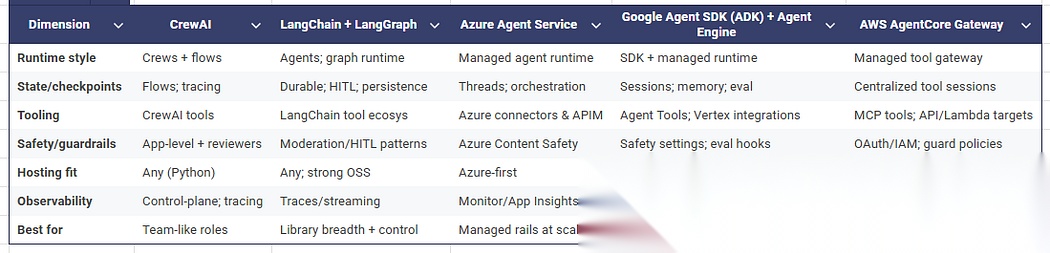 - 若需明确的节点、重试机制与检查点,选择有状态的图运行时(如 LangGraph);若需模拟人类角色(如规划员 / 研究员 / 审核员)协作,则选择基于角色的协作框架(如 CrewAI)。