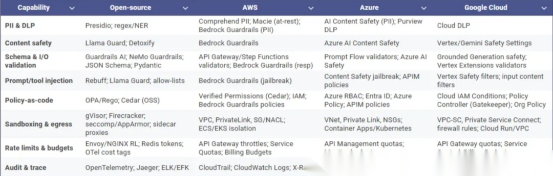 - 实施个人身份信息(PII)脱敏 / 数据防泄漏(DLP)、内容安全(如毒性内容、自残倾向内容检测等)、策略即代码(允许 / 禁止)与沙箱隔离(网络出口、文件系统)。