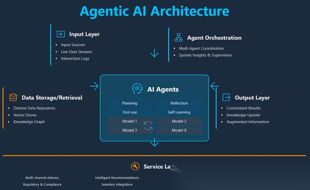 智能体AI架构(Agentic AI Architecture)是一种软件系统,其中自主(半自主)的智能体,通过“规划行动→调用工具→观察结果→更新自身认知”循环重复执行,直到达成目标时,满足安全或策略约束的管理。可将其视为一名 AI“操作员”,能够分解任务、适时调用合适的服务、自检工作,并在高风险环境下完成或请求帮助(例如人工审核)。
