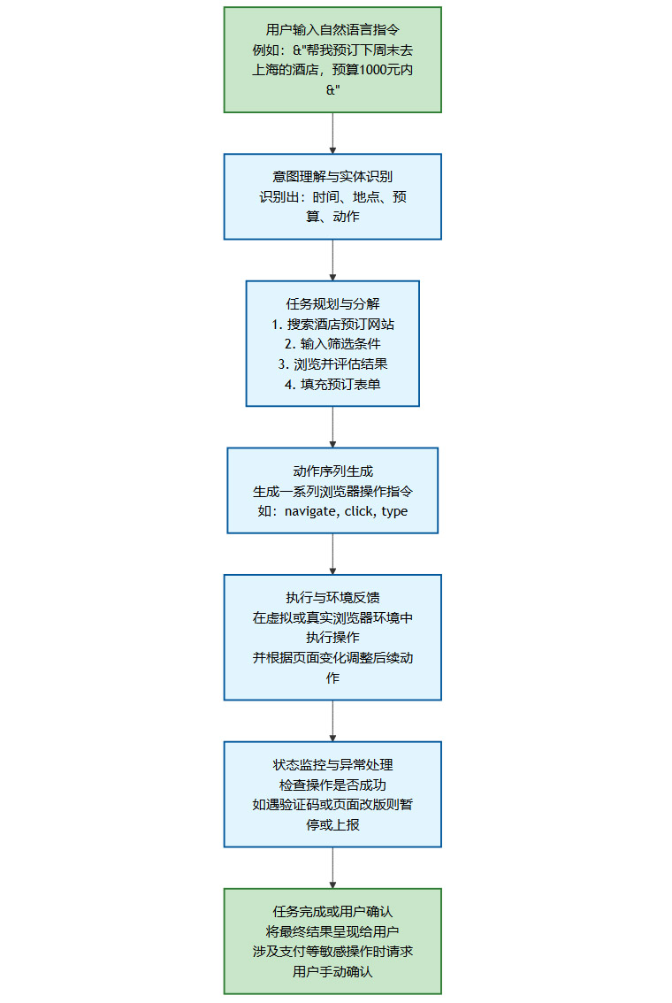 智能体模式是Atlas最具革命性的功能。 它允许浏览器在获得用户授权后,自主执行跨越多个步骤甚至多个网站的复杂任务。这背后是一套完整的“意图理解-任务分解-动作执行”工作流。