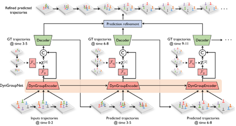 基于提出一个预测系统,以DyGroupNet为编码过程的核心组件,通过将预测轨迹设置为下一个编码输入,对未来轨迹进行递归预测。