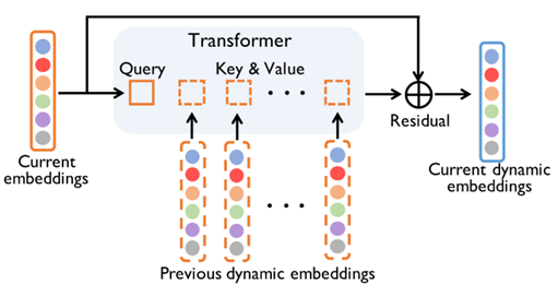进化的动态embedding和和其位置向量(通过MLP得到)相加,然后再多次串联,得到k次以前的动态embeddings,而当前动态embedding通过transformer结构得到