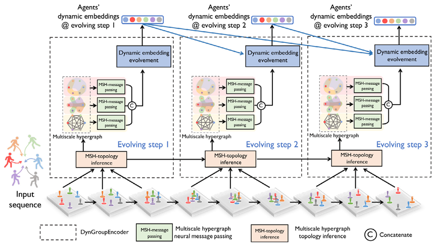 2)在动态环境中考虑时空交互,在拓扑和表示上将多尺度超图进化为动态的多尺度超图,建模群体的动态和群体内部的交互。主要通过一个循环编码和关联矩阵来拓扑,还有一个基于transformer的动态嵌入进化,结合先前的交互信息来进行当前的交互建模