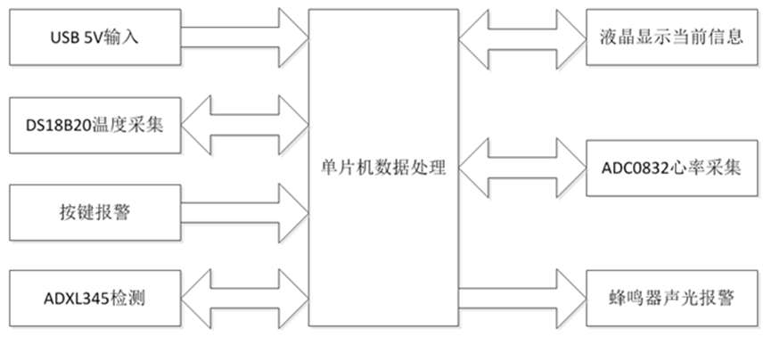 本文介绍了一种以单片机为核心的睡眠监测系统。该系统使用心率、体温等传感器测量人体当前的生理状况,并使用ADXL345传感器测量人体的翻身次数。解决如何在LCD屏幕上进行数据采集和处理是首要问题。因此,选择了8052内核的STC89C52单片机作为核心控制器,经过仔细思考并结合实际工作条件做出了决策。为了节约成本,选择了内存容量为8KB的52单片机,而不是更复杂、更昂贵的单片机如STM32或MSP430。信息显示方面,采用LCD 1602来弥补传统数码管显示信息量有限的不足,可以显示当前的心率、体温和翻身次数等信息。LCD1602还具备数字显示功能,可以调节屏幕亮度以节约资源。最终,单片机将采集到的数据显示出来,供人们观测和学习。使用ADC0832进行模数转换以获取心跳数据,使用DS18B20温度传感器获取体温数据。同时,利用ADXL345传感器判定当前的翻滚次数。