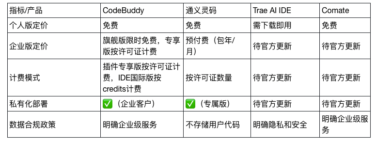 多数厂商采用“个人免费,企业付费”的混合模式。企业版的核心价值在于提供标准功能之外的增值服务。通义灵码和CodeBuddy都明确提供了企业私域知识库集成、数据保护、单点登录(SSO)以及定制化服务等能力。这表明企业级市场的竞争焦点已从功能转向服务和信任。组织对数据安全和知识产权的担忧是推动厂商提供私有化部署和明确数据合规机制的直接原因。