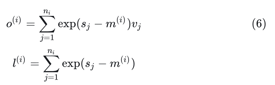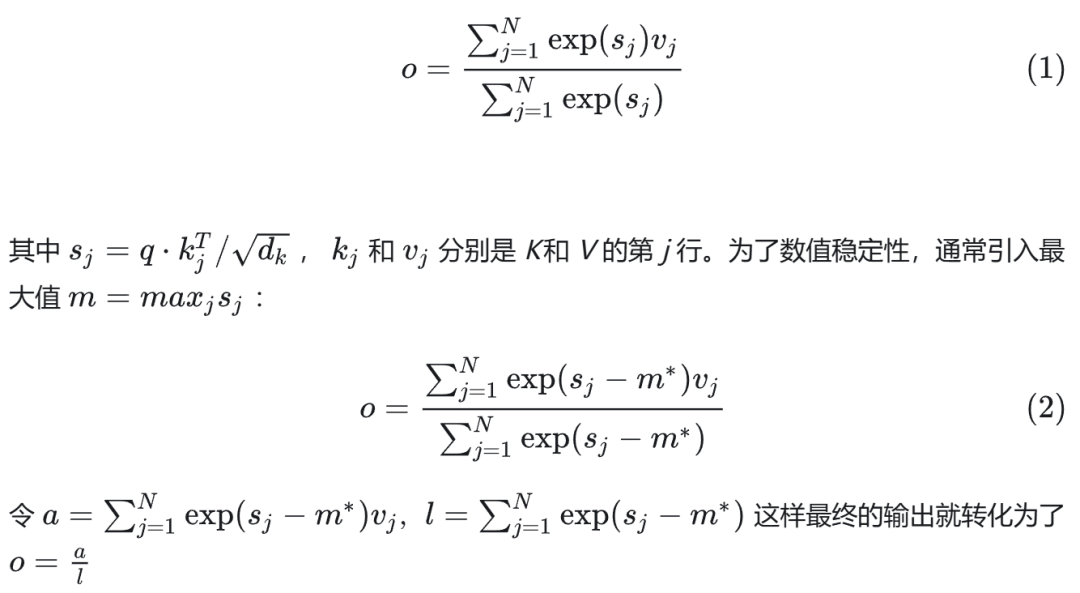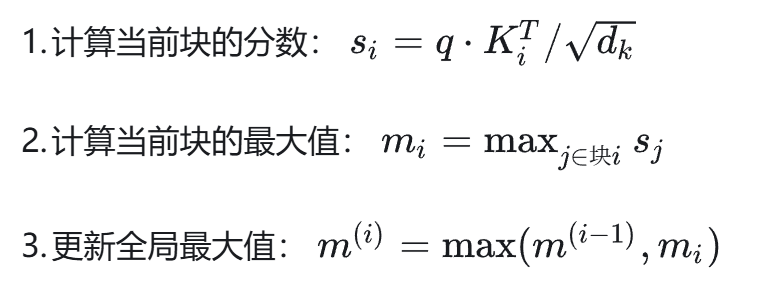 分块计算里面有两个问题,一个是 softmax 函数是按整行计算的,所以如果切成两个小块分别计算再拼起来是不准确的(因为分母不一样),所以必须想到一种办法可以让不断的更新全局最大值。