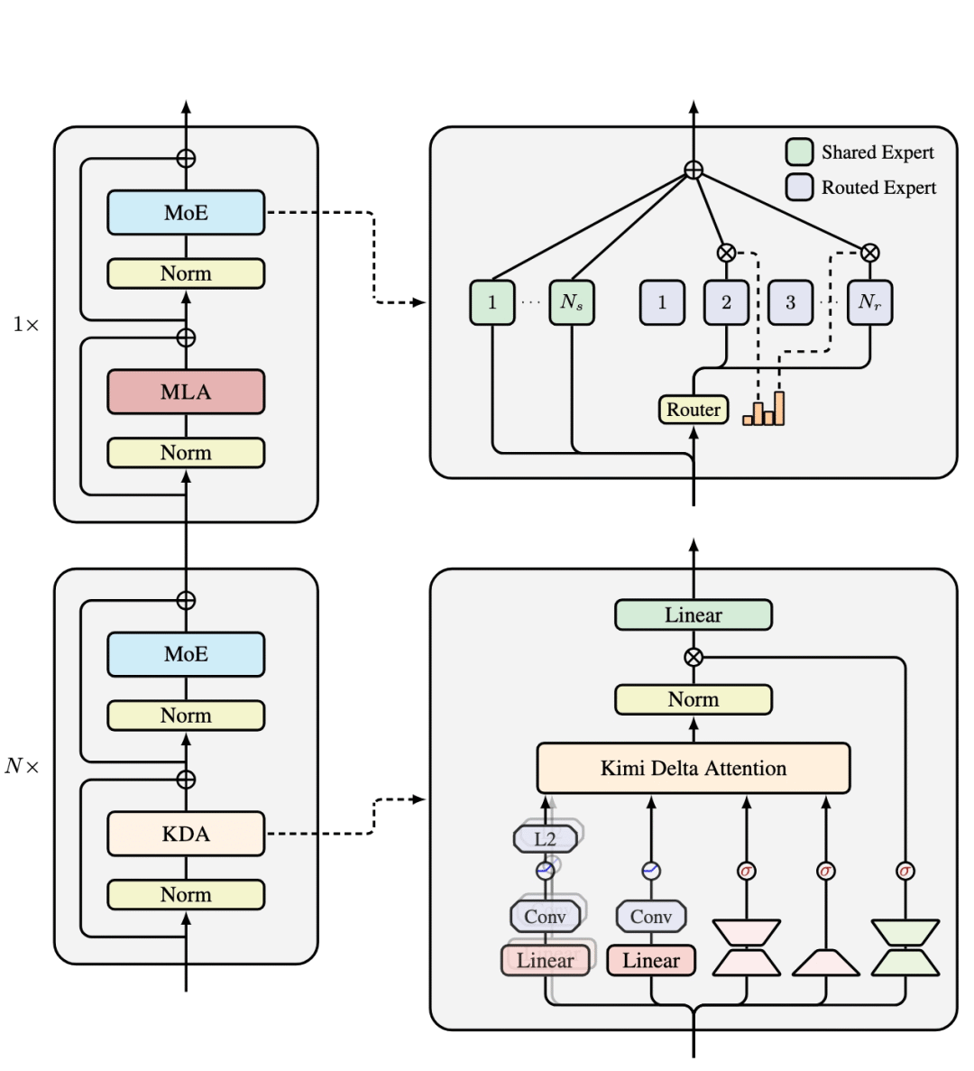 - Kimi Delta Attention (KDA):一种线性注意力机制,它通过细粒度的门控来改进门控 delta 规则。