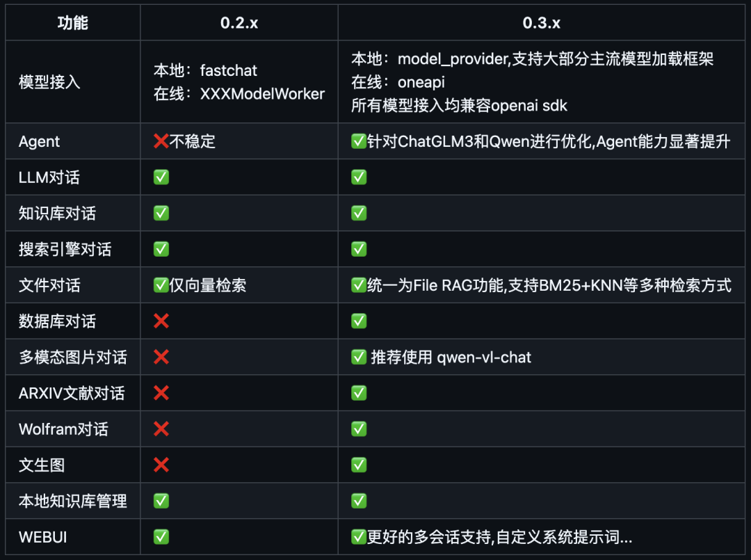 - 从 0.3.0 版本起,Langchain-Chatchat 不再根据用户输入的本地模型路径直接进行模型加载,涉及到的模型种类包括 LLM、Embedding、Reranker 及后续会提供支持的多模态模型等,均改为支持市面常见的各大模型推理框架接入,如 Xinference、Ollama、LocalAI、FastChat、One API 等。