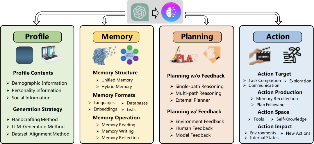 这个图大概是对Agent阐述最多的了。作为一个经典的Agent框架图,也是最基础的,明确说明了现在Agent所涉及的模块,以及模块涉及的技术点,但随着国内技术的一日千里,描述也稍有欠缺了。
