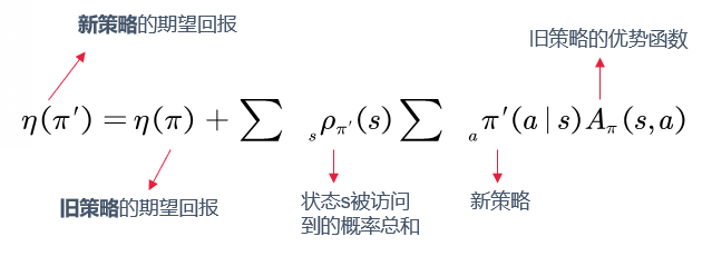 这个公式的核心就是: 新策略的回报 = 旧策略的回报 + “在新策略的状态分布下,执行新策略动作所能带来的(相对于旧策略的)优势总和”