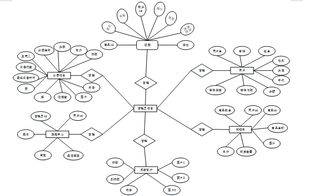 通过对猫咪咖啡馆预约系统的主要功能信息进行规划并分为若干功能实体信息,实体信息将使用E-R图加以表示,将“购物车、用户、系统简介、客服中心、收藏、公告信息”等作为实体,它们的局部E-R图,如图4-5所示: