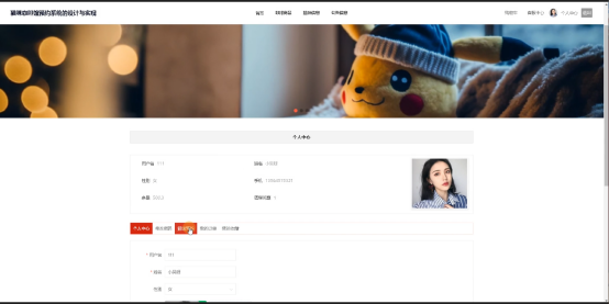个人中心:在个人中心页面可以对个人中心、修改密码、猫咪预约、我的订单、我的收藏进行详细操作;如图5-5所示: