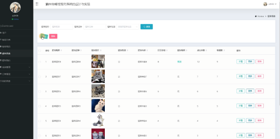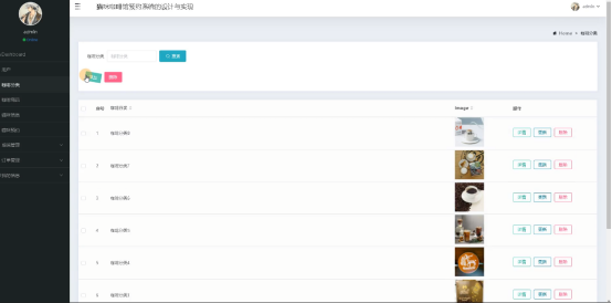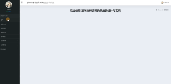 管理员进入主页面,主要功能包括对用户、咖啡分类、咖啡商品、猫咪信息、猫咪预约、系统管理、订单管理、我的信息等进行操作。管理员主页面如图5-7示: