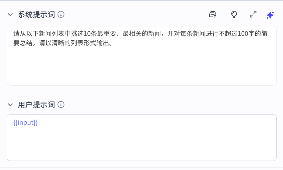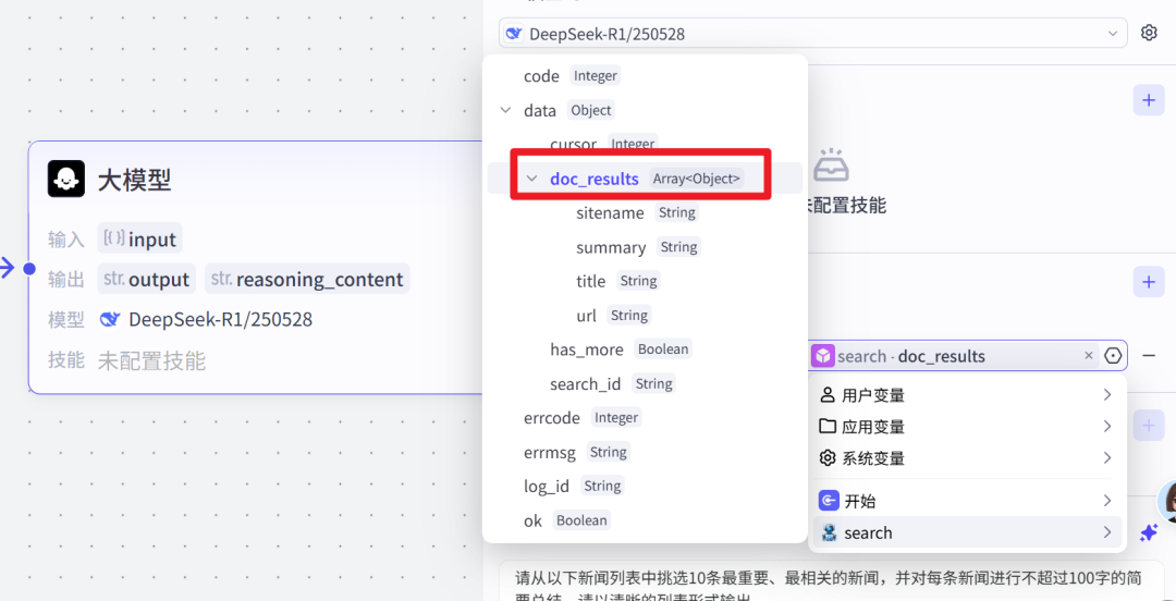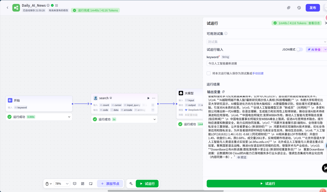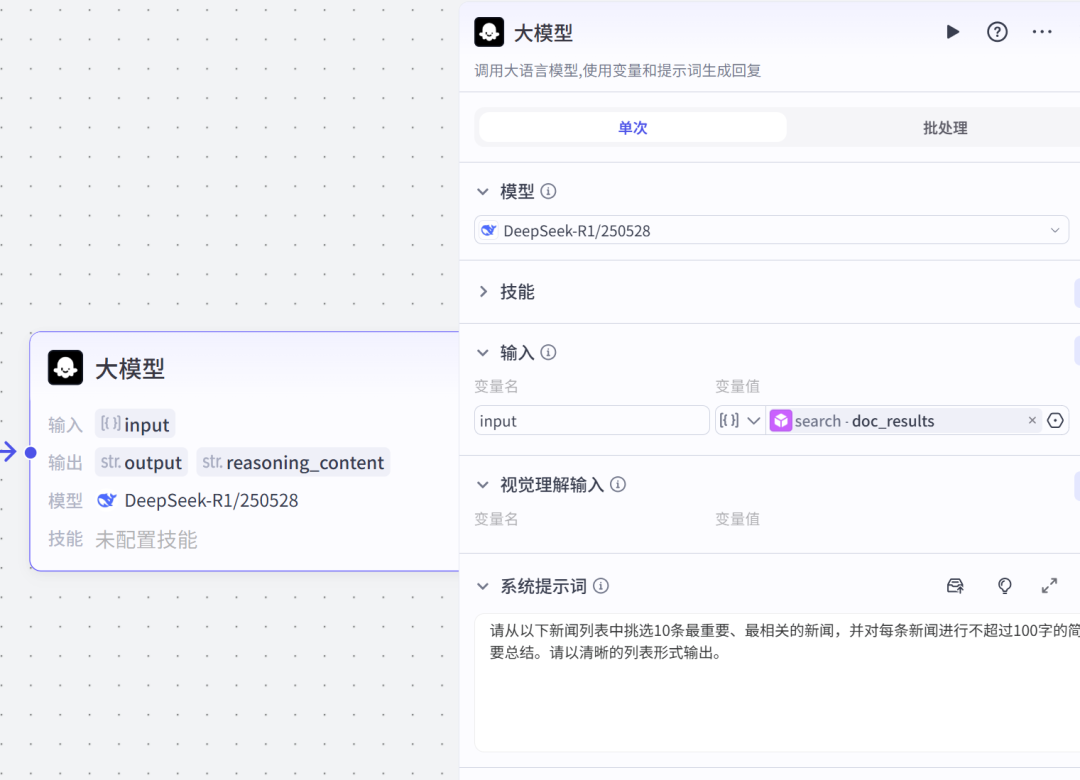 其中,“头条搜索”插件用来获取新闻内容,“大模型”节点用来提炼要点。