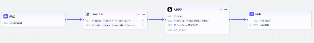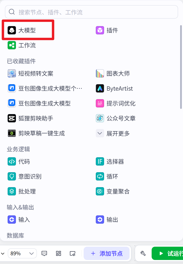 在这里,我们只需要找到两个节点:“头条搜索”插件和“大模型”节点