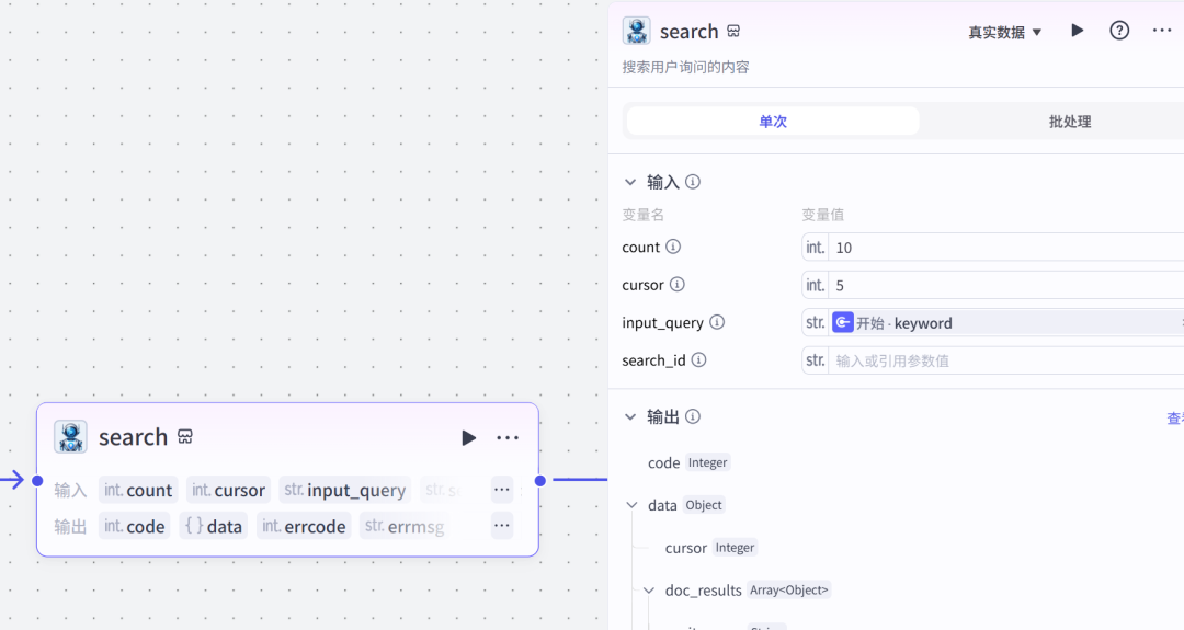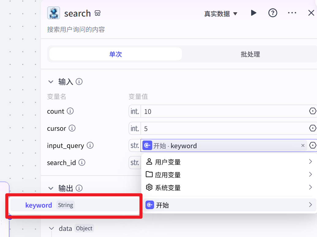 给“头条搜索”插件的输入变量input_query,选择刚刚在“开始”节点设置好的“keywordl”