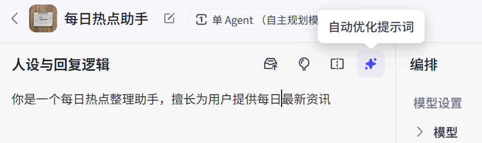 回到“每日热点助手”智能体编辑界面,在prompt里加上一句话: