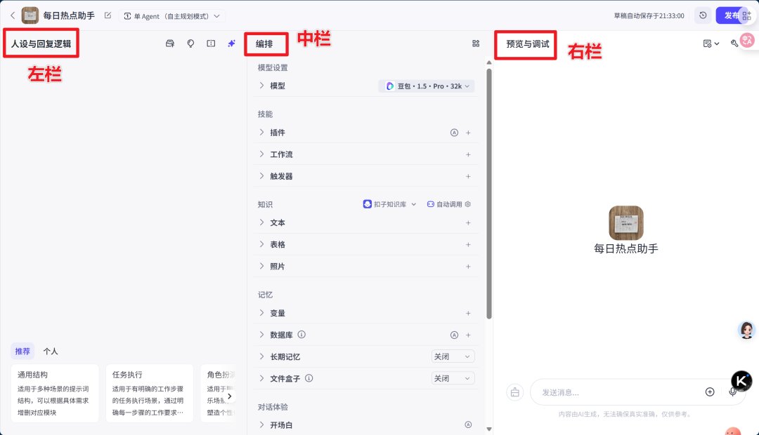 进入智能体设置界面后,你会看到一个功能强大的工作区。这个界面被划分为了左、中、右三栏主要区域: