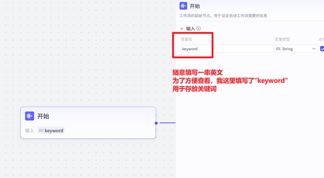 接着,点击“开始”节点,将输入变量,设置为“keyword”,用来存放关键词: