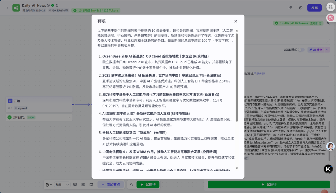 这样,一条完整的“每日热点助手”工作流就创建完了!