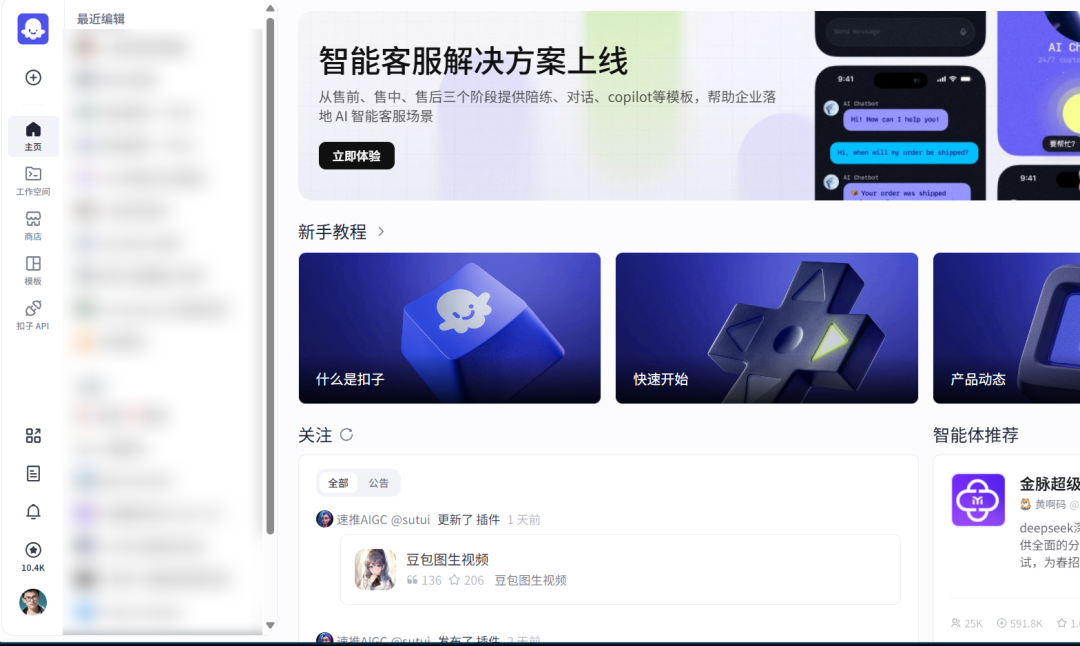 打开扣子官网 (https://www.coze.cn/),抖音扫码或手机号码登录后,即可进入主界面。