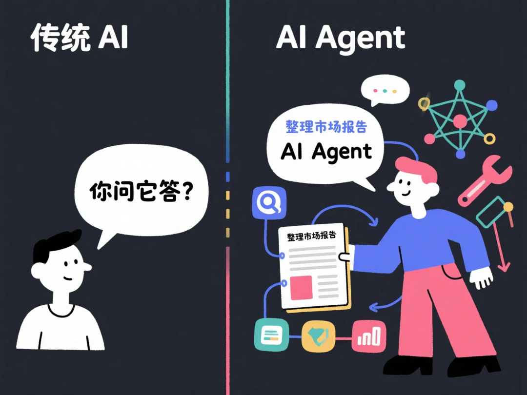 而AI Agent,则是一个能“干活”的行动者。你给它一个任务,比如“帮我整理一份市场报告”,它能像一个真正的助理,自己去上网搜索、调用工具、分析整合,最后直接交付给你一份完整的结果。