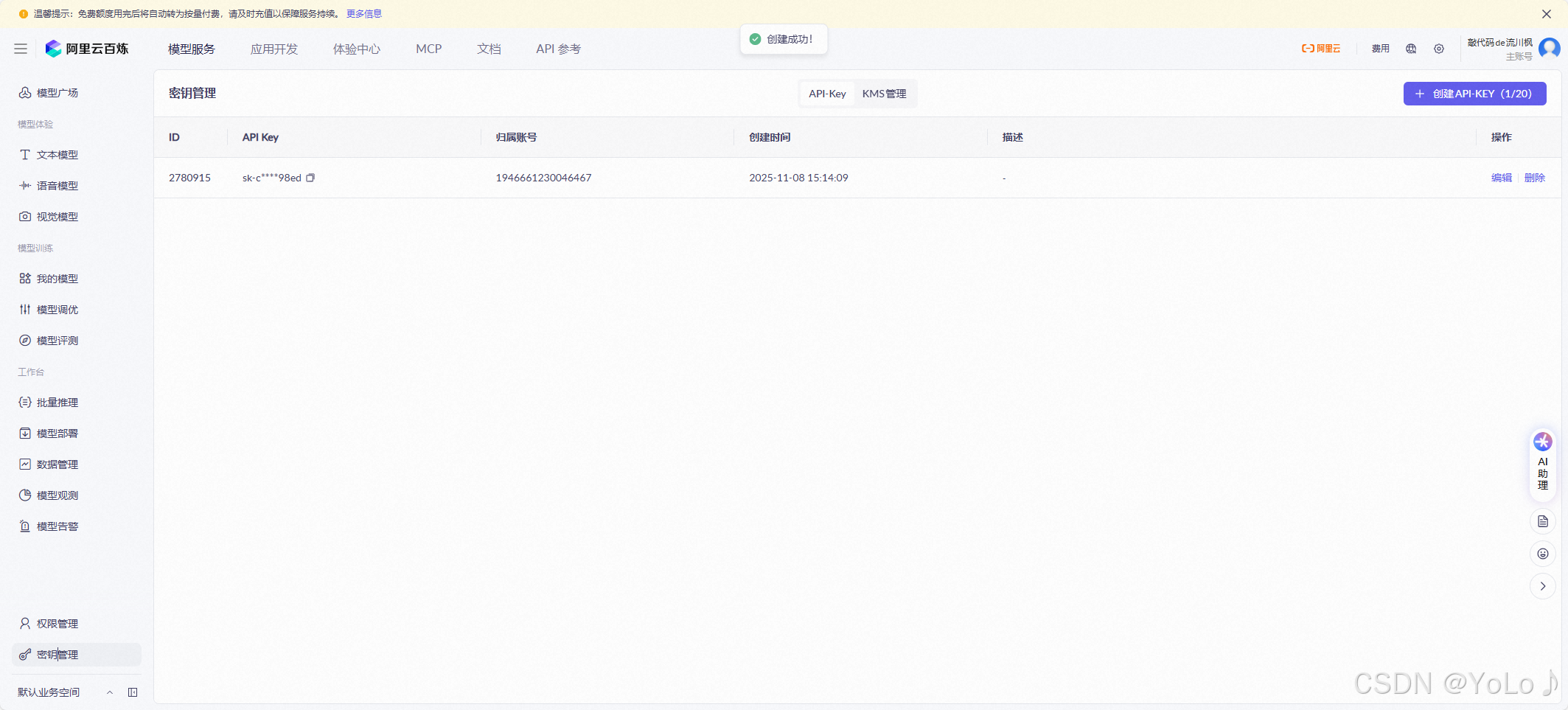 首先需要从大模型供应商获取APIKey,我们这里使用阿里的大模型
