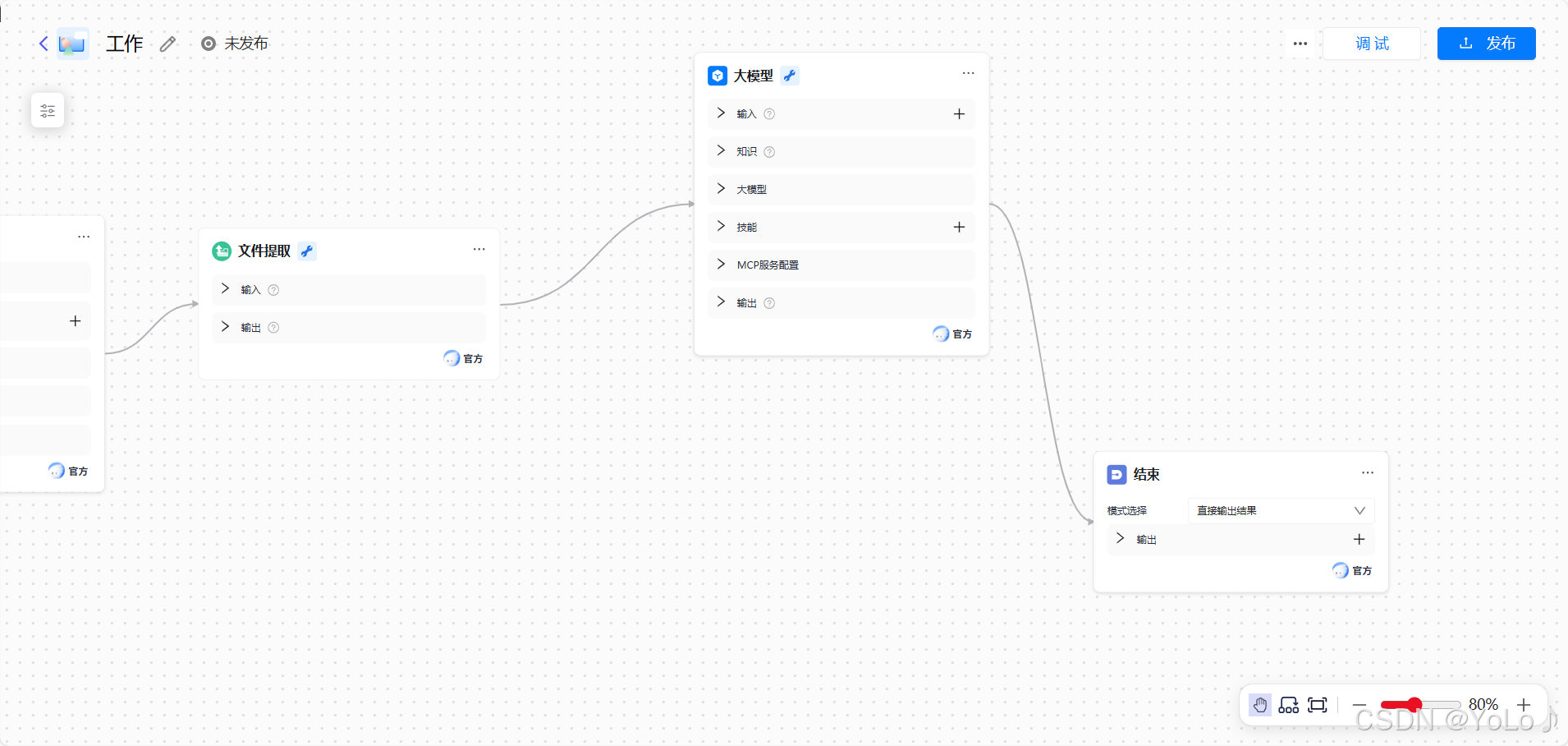 有兴趣的伙伴还可以了解其他更丰富玩法,比如自己设计编排/调试工作流。可视化拖拽编排是ModelEngine的核心优势,无需编写底层代码,只需在图形化界面中通过简单的“拖、拉、连”操作,即可将单个节点组合成完整、可执行的AI应用流程。