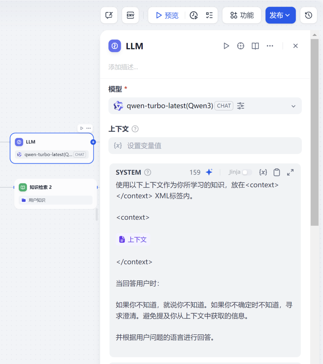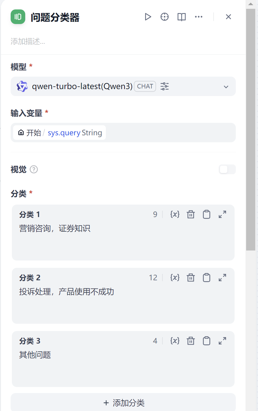 2、添加问题分类器,模型选择qwen-turbo-latest,进行分类1和分类2都需要用到知识库,可以参考我专门一讲分享知识库。