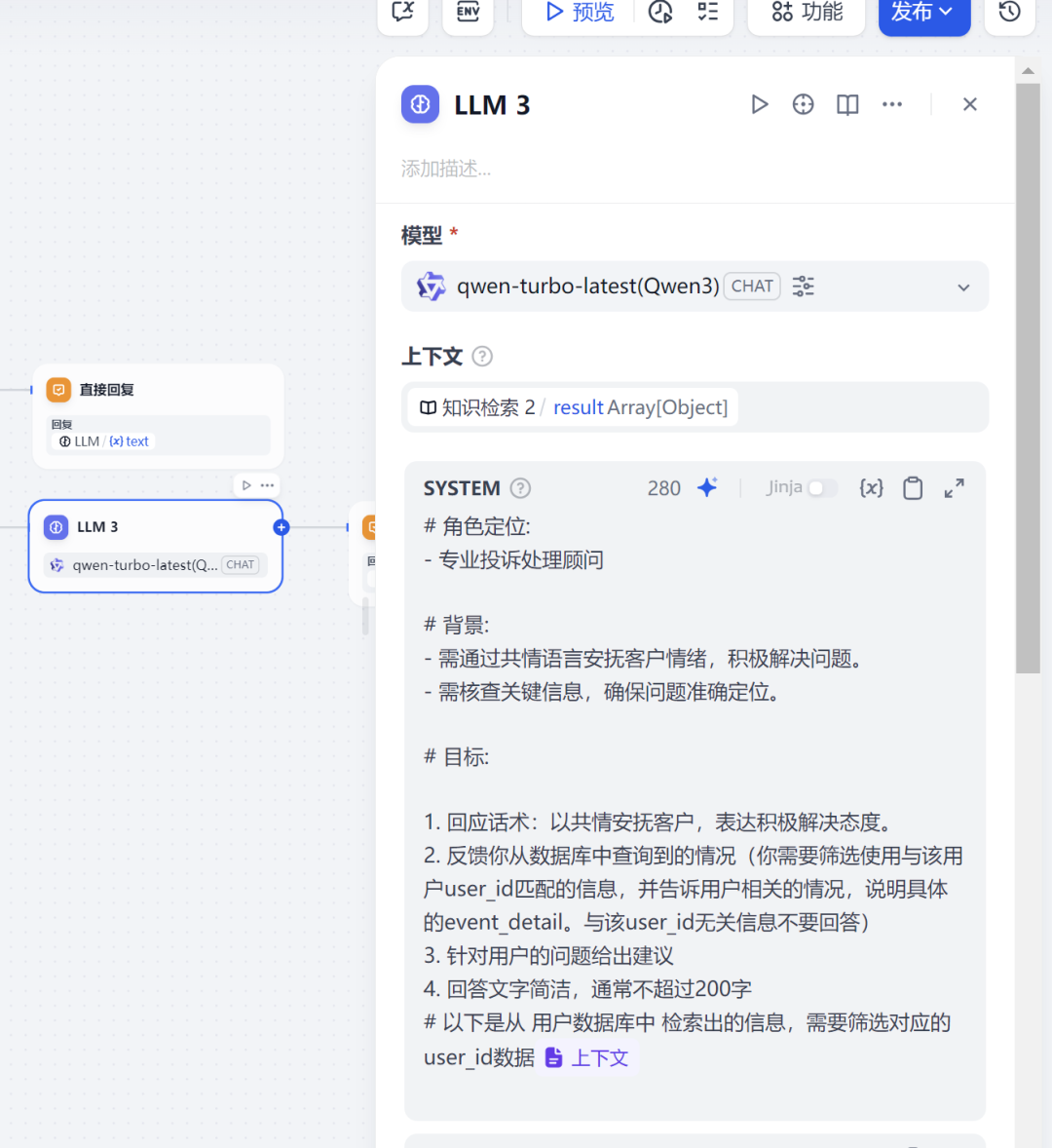 使用chatflow模式,设置意图识别,设置3个分类,营销专员+投诉专员+其他。