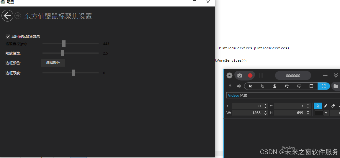 未来之窗人工智能鼠标跟随_LensMagnifierOverlay类是实现该功能的核心。它依赖于未来之窗人工智能鼠标跟随_LensSettings类所提供的参数设置,以及IPlatformServices接口获取系统相关信息。未来之窗人工智能鼠标跟随_LensSettings类负责管理各项关键设置。其中,Enabled用于控制功能是否启用;LensDiameter可设置透镜直径,取值范围在 100 到 1000 之间,默认 400,能够根据实际需求灵活调整透镜覆盖范围;ZoomFactor控制放大倍数,范围为 1.1 到 5.0,默认 2.0,满足不同程度的细节展示需求;BorderColor设定边框颜色,默认红色;BorderThickness设置边框厚度,范围 1 到 10,默认 2,可对透镜进行个性化装饰。