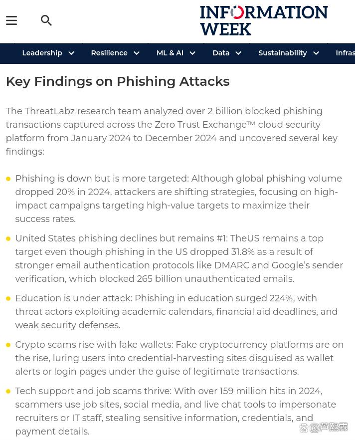 网络钓鱼(Phishing)作为社会工程攻击的主要形式,长期以来是数据泄露与账户接管事件的重要诱因。尽管过去十年中,电子邮件认证协议(如SPF、DKIM、DMARC)、反垃圾邮件引擎及用户安全意识培训显著降低了大规模广撒网式钓鱼的成功率,但攻击者并未退却,而是转向更隐蔽、更精准、更具欺骗性的战术。据Zscaler ThreatLabz于2025年发布的报告,2024年全球钓鱼攻击总量同比下降20%,但针对高价值目标(如企业财务、人力资源及IT管理人员)的定向攻击成功率显著上升。这一“量减质升”的转变,标志着钓鱼攻击已进入智能化、协同化与场景化的新阶段。