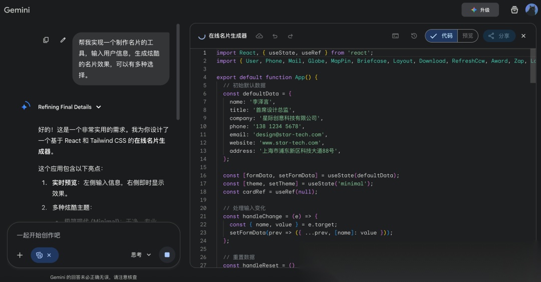 - gemini 官网已经有了最新模型,选择「Canvas」,这样你要实现的东西都会在右侧区域生成并预览出效果。