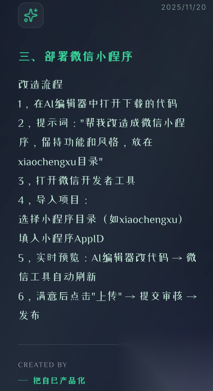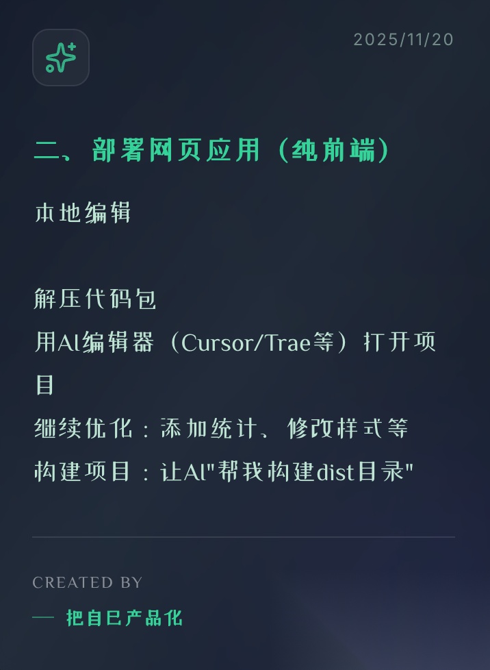 2,好了,你现在知道哪里能用,也能一句话让 AI 帮你实现了,觉得效果还不错,就回到了本文的主题:那我怎么部署呢?或者说变成我自己的一个应用?