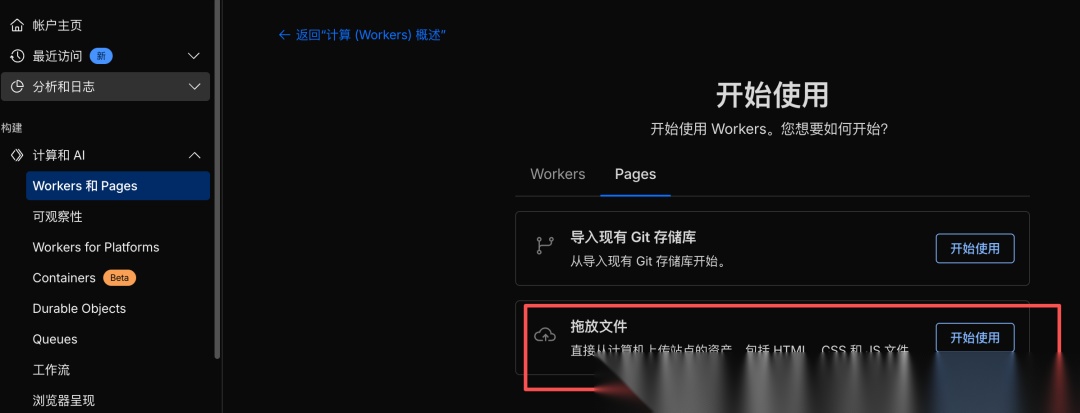 进入到这个 page 页面,创建一个项目,上传 dist 目录(其他的文件可以不要)。