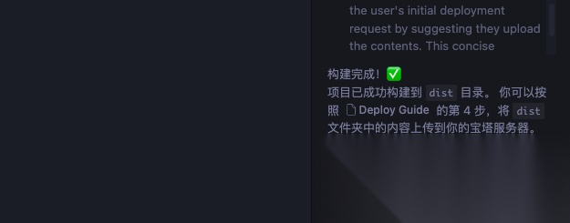 然后就是让它构建项目,会生成一个 dist 的目录,比如你直接说,帮我构建 dist 目录。