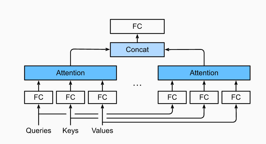 - • 输入嵌入被拆分,每个“头”获得自己的一组 Q、K、V 矩阵,并并行执行注意力计算。