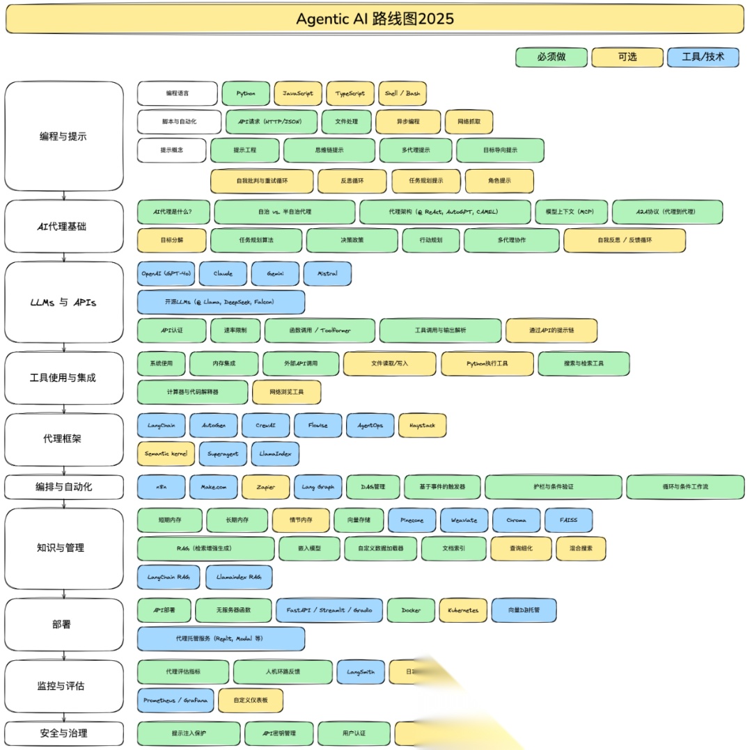 今天,我们将通过一份2025年AI Agent开发路线图,全面解析Agent开发领域的核心技术栈和发展路径。