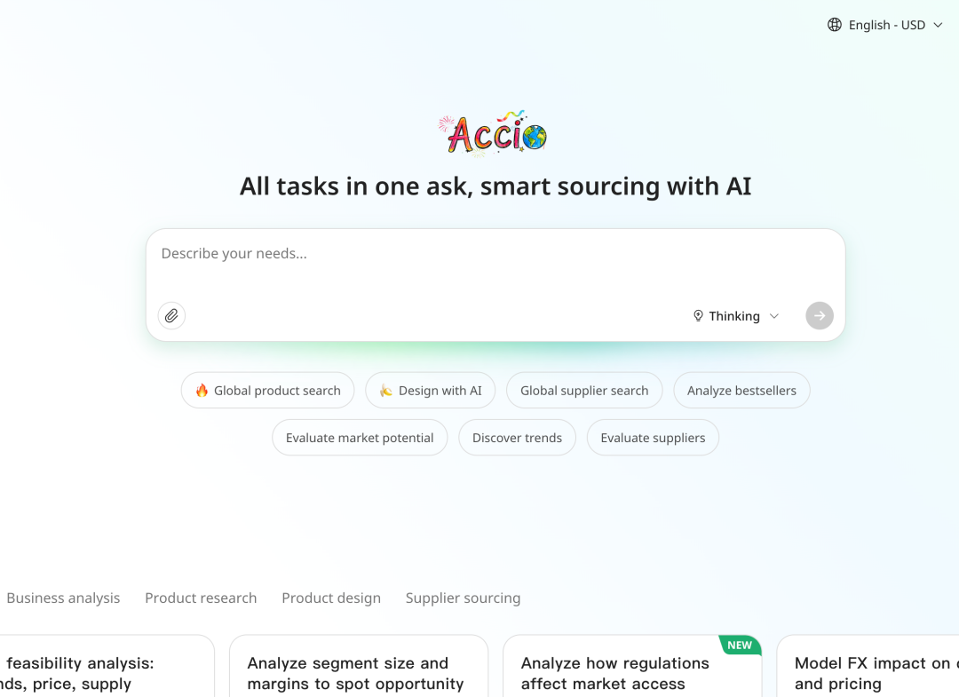 阿里巴巴国际站推出的AI智能采购Agent。支持市场调研与趋势分析、供应商筛选与对比、AI商品百科页、全流程采购。