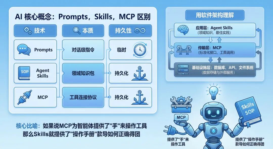 很多人会问:Skills、Prompts、MCP 到底有什么区别?可以简单这样理解:
