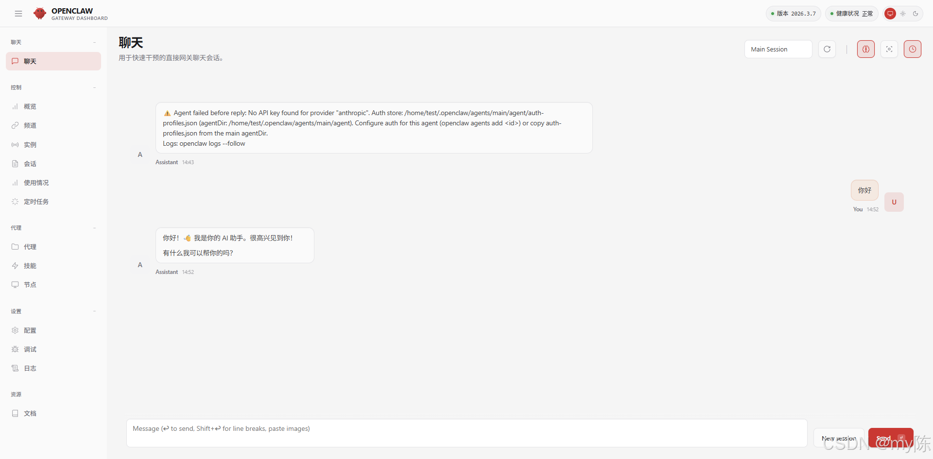 7.web访问(暂时还用不了要配置AI模型)本地访问地址http://127.0.0.1:18789/chat?session=agent%3Amain%3Amain