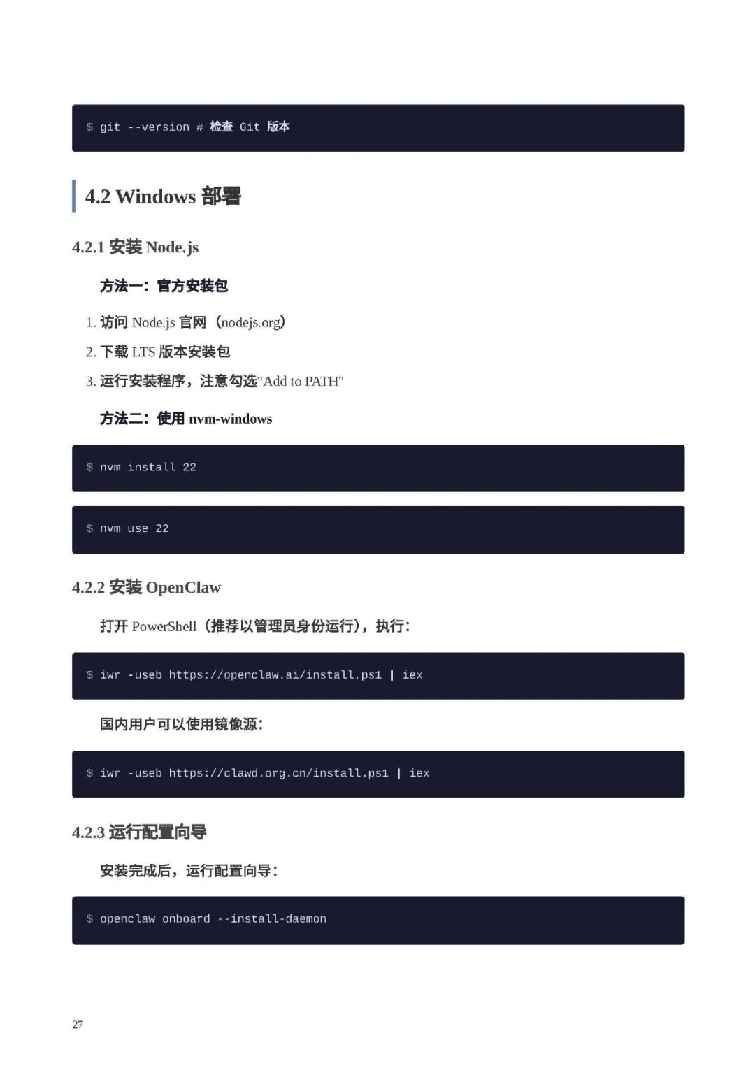 部署前提:明确硬件要求(最低 2 核 4G,推荐 4 核 8G),软件依赖 Node.js 22+、npm、Git(可选)、Docker(可选),并给出前置检查命令。