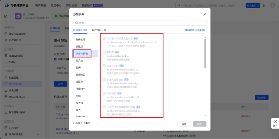 添加后会在已添加事件中看到,然后点击事件配置中的订阅方式(使用长连接)→保存