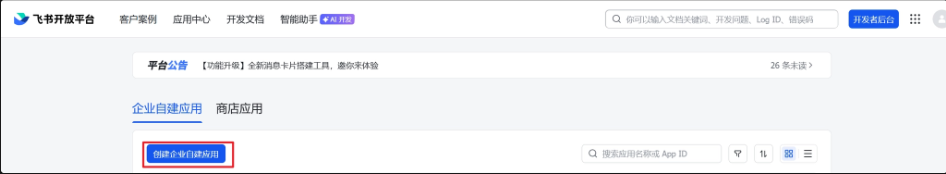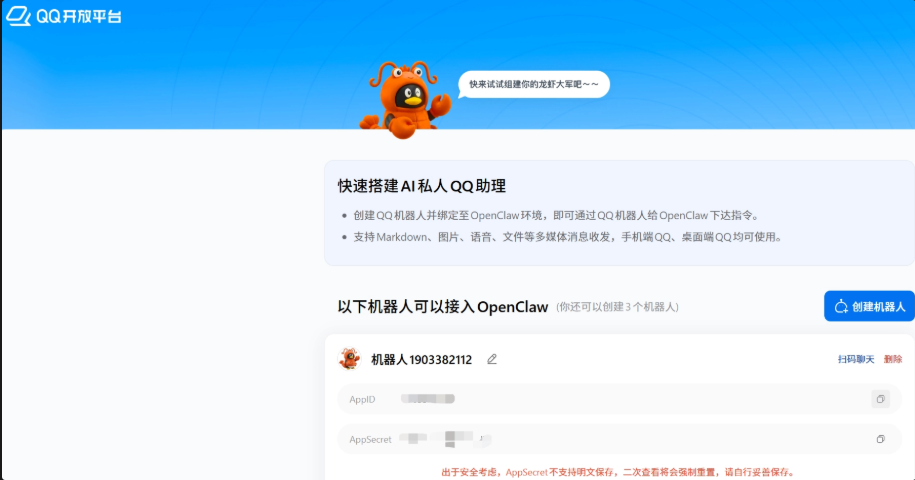 step2 : 在该页面创建机器人,获得AppID和AppSecret