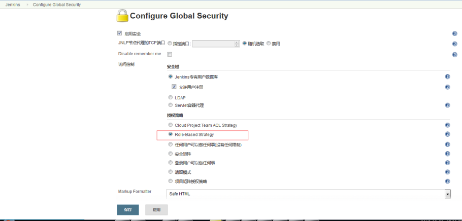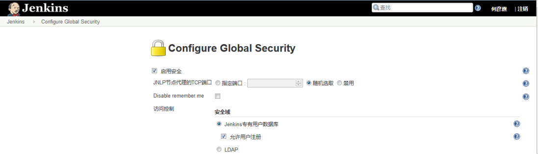 在已运行的Jenkins主页中,点击左侧的系统管理—>Configure Global Security进入如下界面: