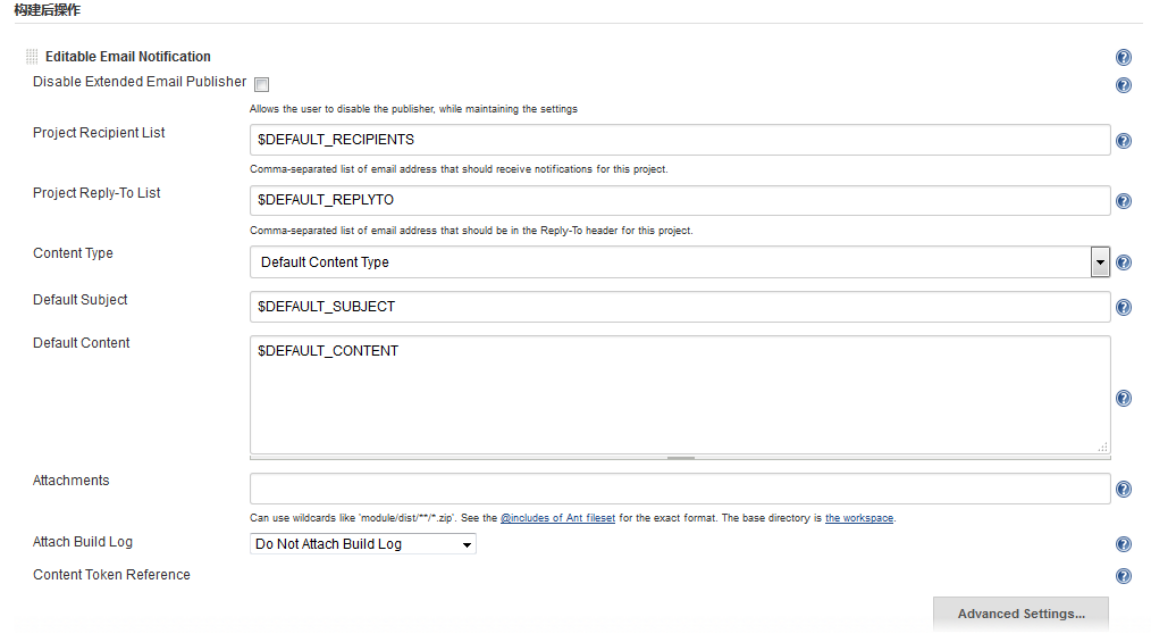 要想在一个项目中使用email-ext插件,你首先必须在项目配置页激活它。在构建后操作——“增加构建后操作步骤”选项中勾选”Editable Email Notification”标签。