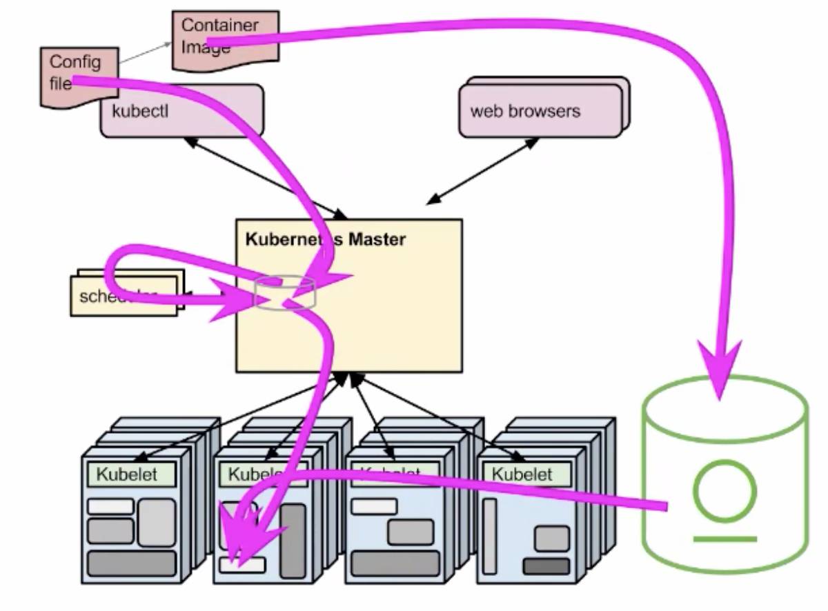 3. Scheduler 定时从 Master 取出任务,并且找到终端(Kubelet,通常是虚拟机)实际执行这个任务。