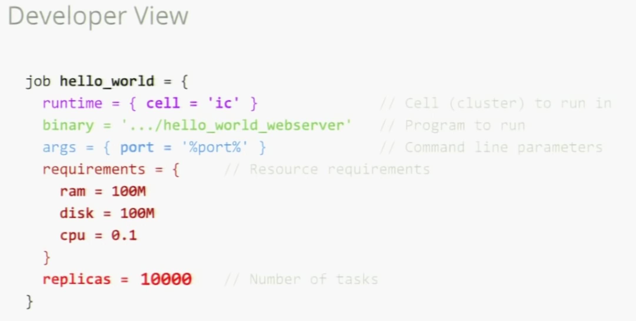 从谷歌开发者的视角来看容器平台,当开发者需要部署一个应用时,他只需要声明这个应用运行的集群,集群中机器的配置,以及服务的拷贝数量。