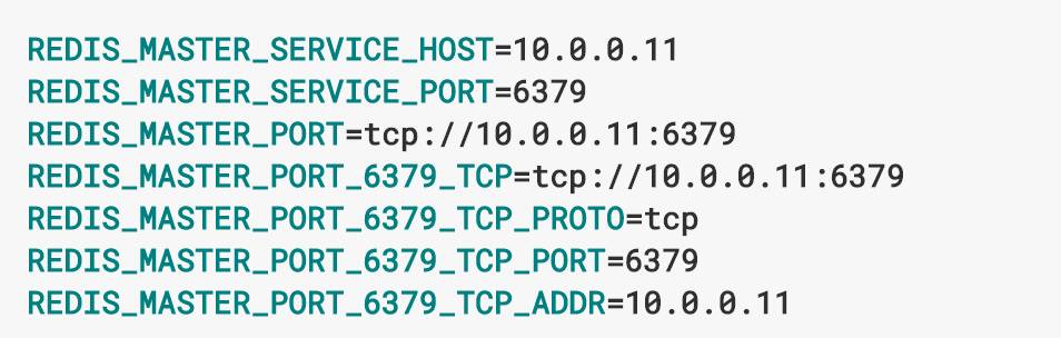 上图的"redis-master"暴露了6379端口,以及在集群里的 IP 地址,如果你的容器声明了对"redis-master"服务的依赖,在你的 Pods 里就能够访问到这些环境变量。