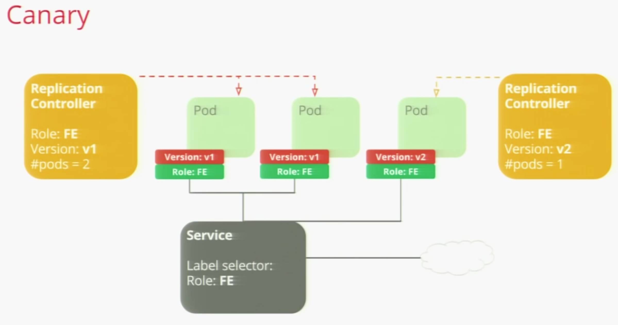 上图说明的是通过 Replication Controller,Labels 和 Service 实现金丝雀部署,通过 Label(Role=FE)找到 FE 服务的两个版本,V1和 V2,用 Service 来屏蔽版本的差异,并且将流量分发给 V1 和 V2 的 Pods。